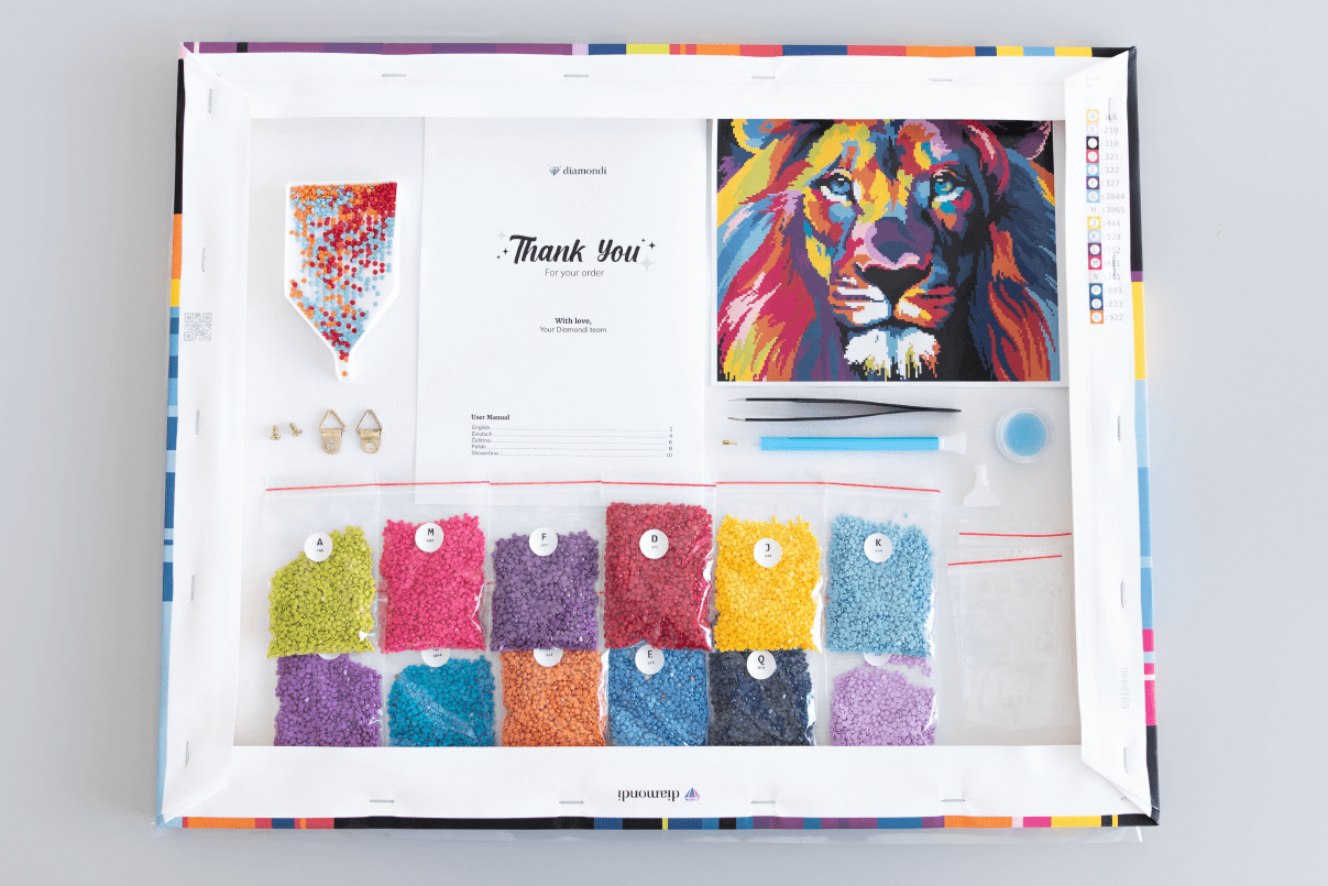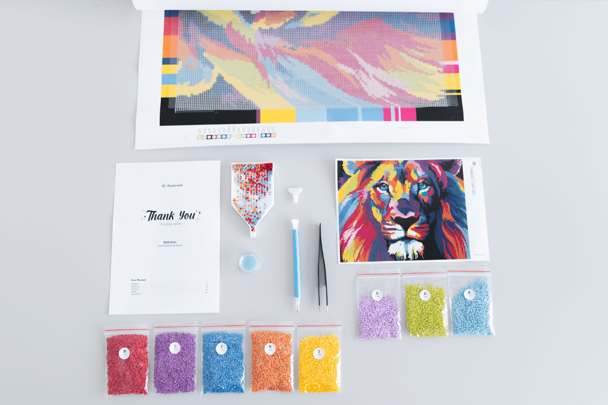 Всичко е внимателно опаковано и надписано, за да можете да започнете шедьовъра си веднага след като отворите кутията. Нашите комплекти имат предварително принтирано платно за рисуване с ясно очертани големи символи, които не натоварват очите, когато създавате картината.