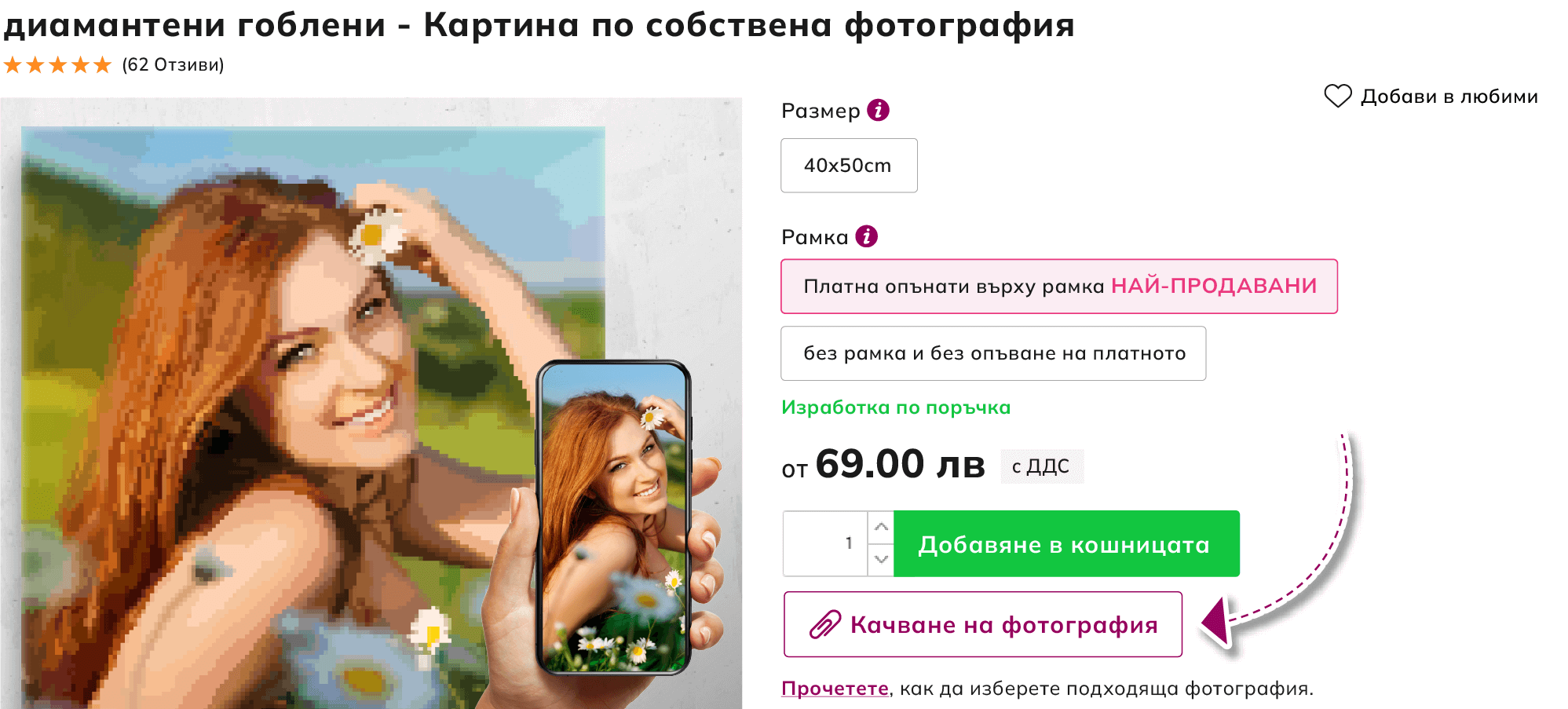 - Поръчайте рисунка, направена по Ваша собствена снимка. Щом сте качили успешно снимката, можете да я добавите във Вашата кошница за пазаруване.