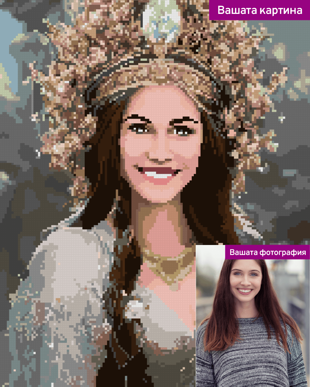 Когато поръчвате, качете Ваша снимка и ние ще я превърнем в диамантен гоблен. Гоблен, направен от Ваша собствена снимка, е страхотен подарък за различни поводи като рождени дни, Коледа или годишнини. Ние изработваме ръчно всеки комплект и наблягаме на уникалното преживяване от създаването на картина. Станете художник днес.