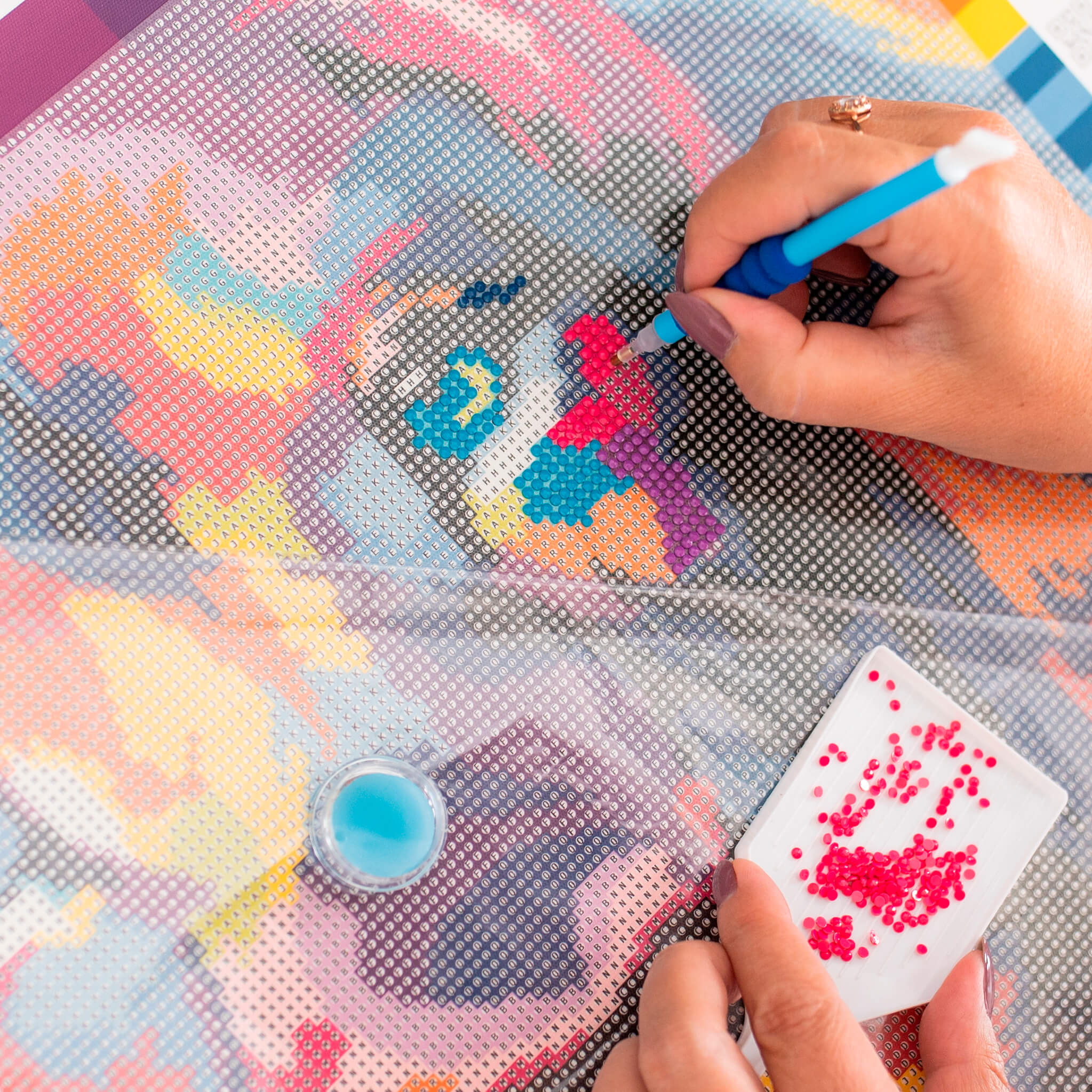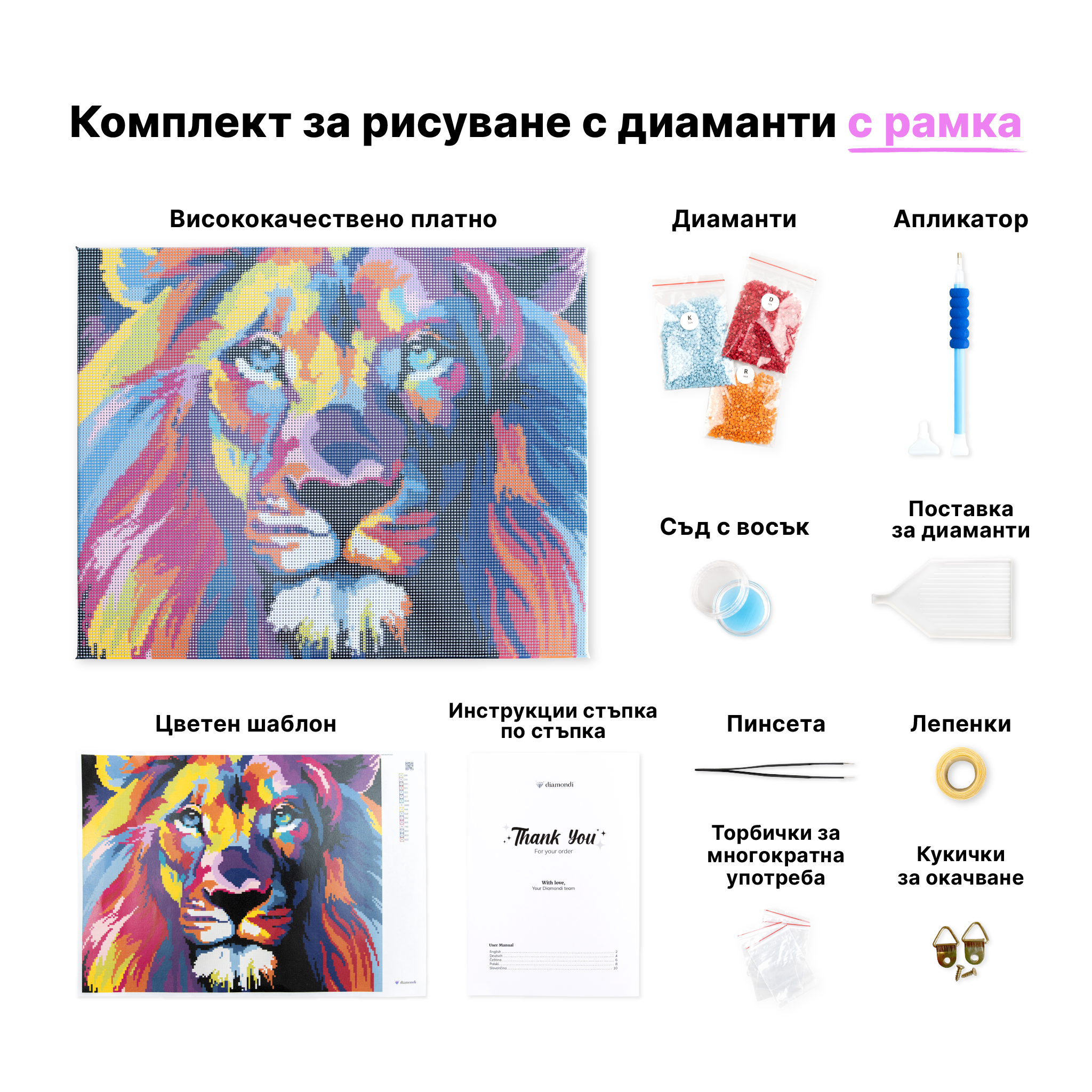 Всичко е внимателно опаковано и надписано, за да можете да започнете шедьовъра си веднага след като отворите кутията. Нашите комплекти имат предварително принтирано платно за рисуване с ясно очертани големи символи, които не натоварват очите, когато създавате картината.