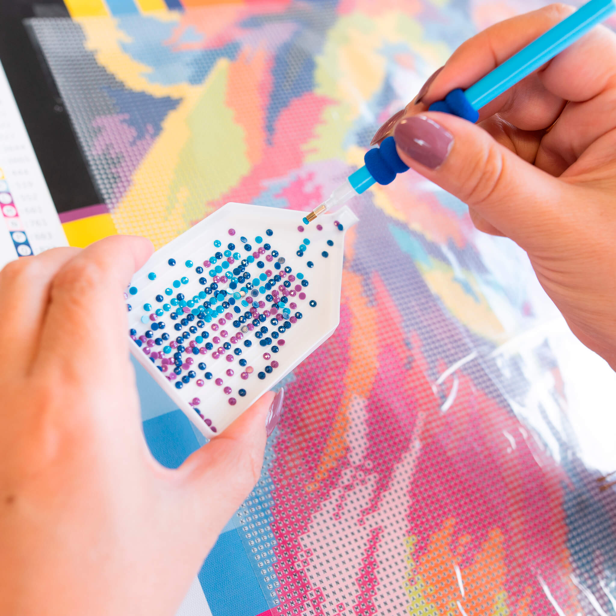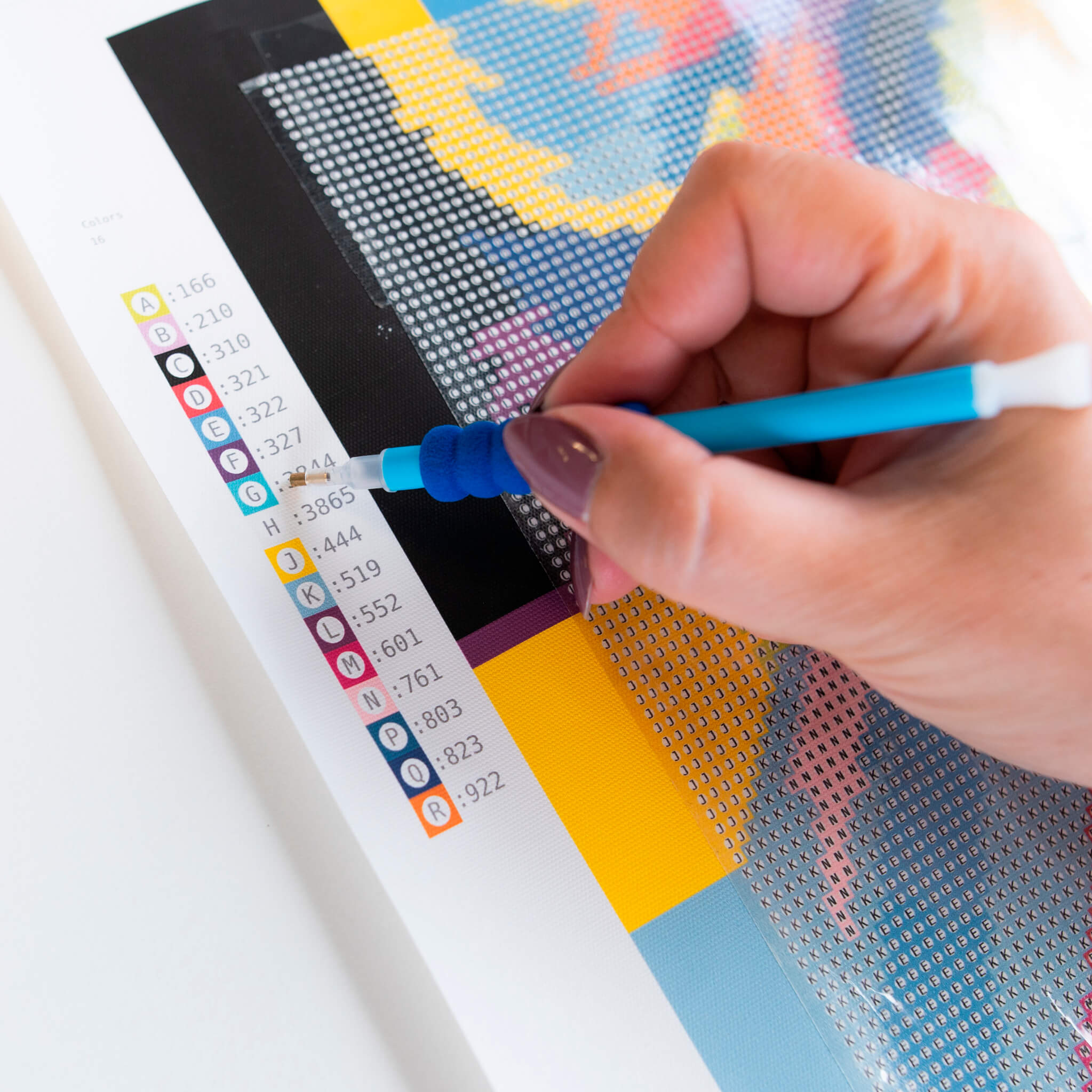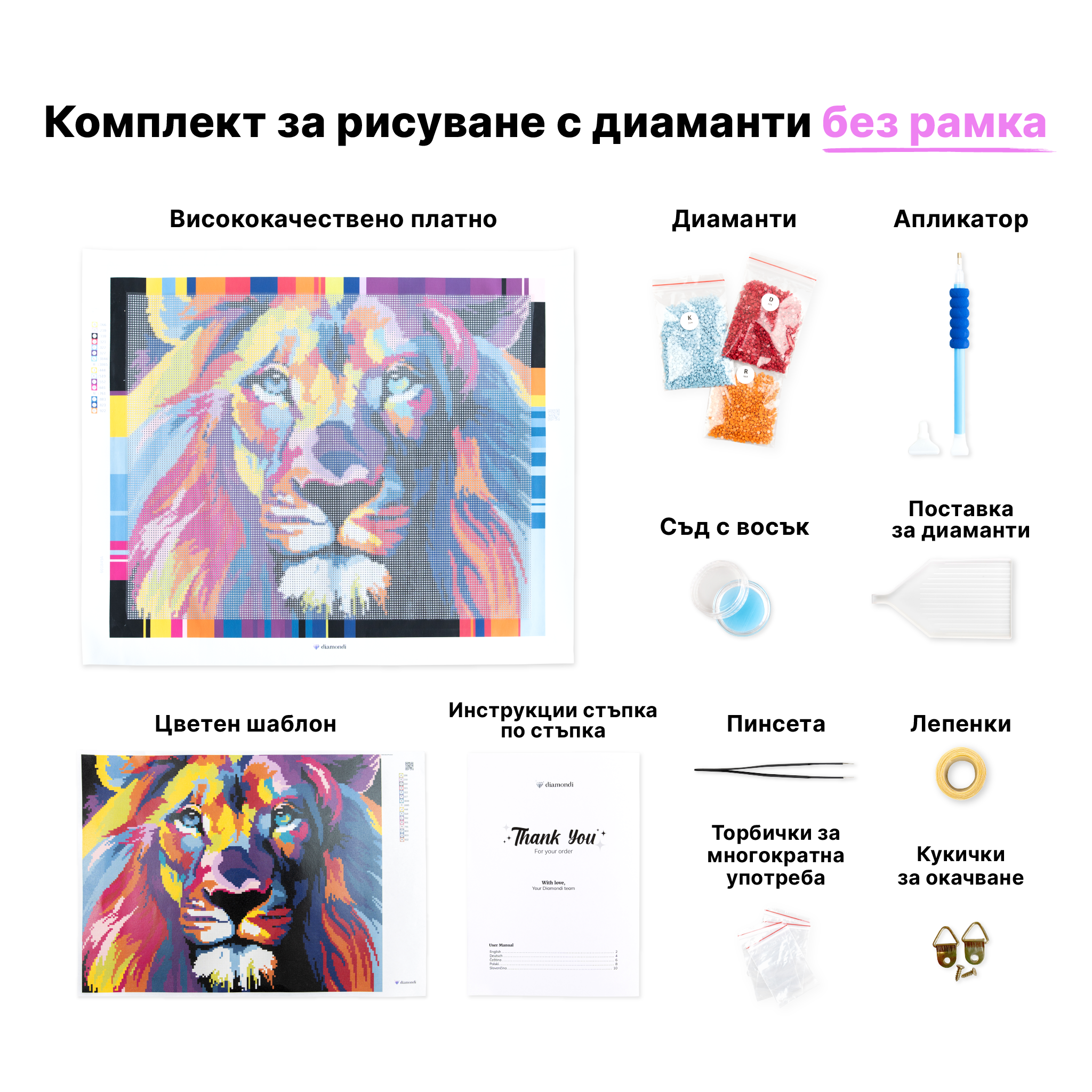Всичко е внимателно опаковано и надписано, за да можете да започнете шедьовъра си веднага след като отворите кутията. Нашите комплекти имат предварително принтирано платно за рисуване с ясно очертани големи символи, които не натоварват очите, когато създавате картината.