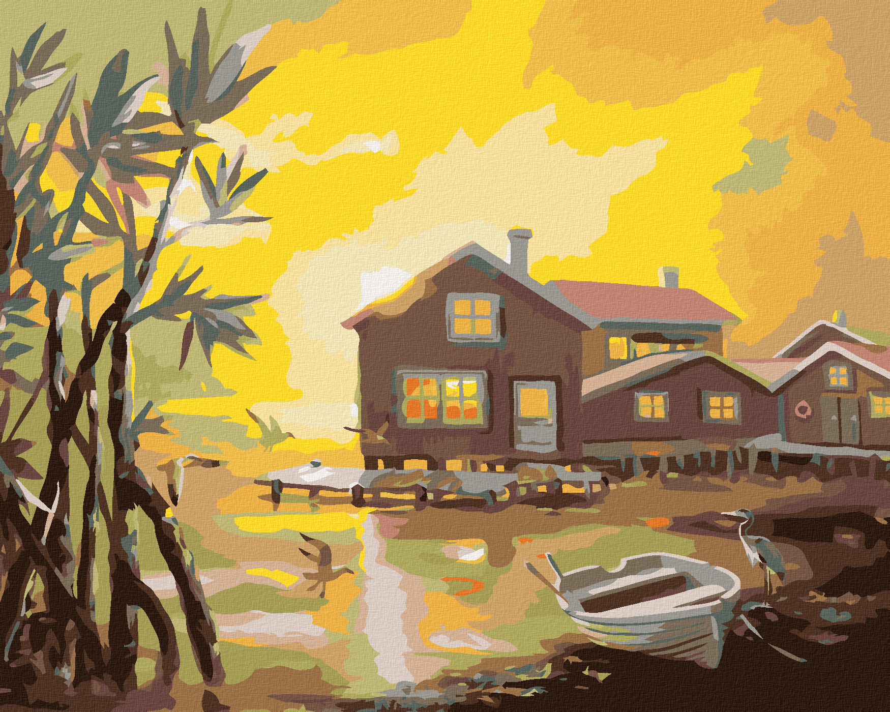 Рисуване по номера - КЪЩИ С КЕЙ КРАЙ ЕЗЕРОТО, ЧАПЛА, ЧАЙКИ И ЗАЛЕЗ (Д. РЪСТИ РЪСТ)