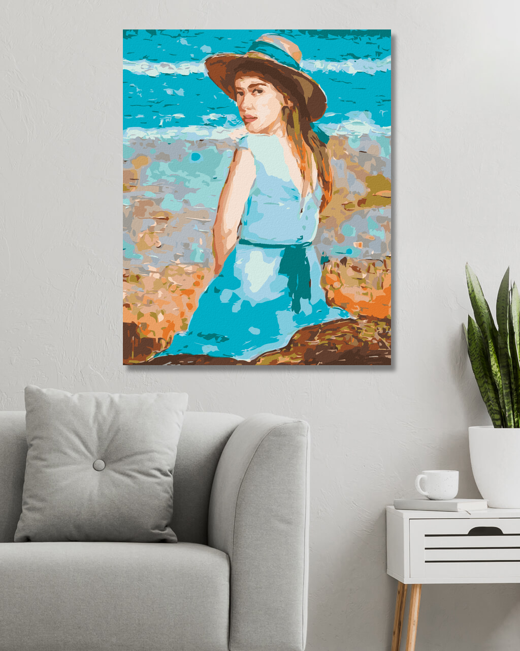Рисуване по номера - МОМИЧЕ В СИНЯ РОКЛЯ С ШАПКА