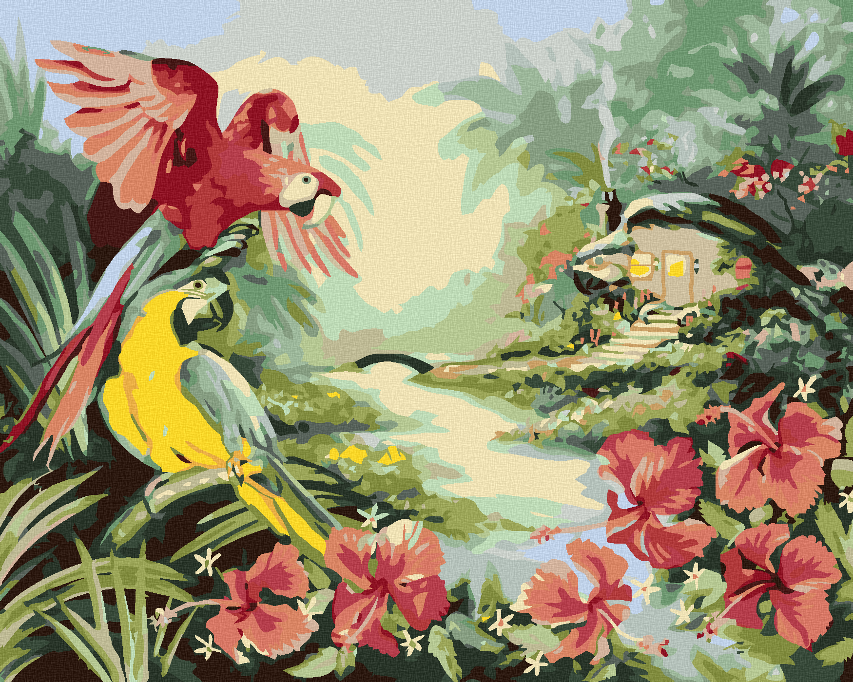 Рисуване по номера - ПАПАГАЛ И ЦВЕТЯ ДО РЕКАТА И ХИЖАТА (Д. РЪСТИ РЪСТ)