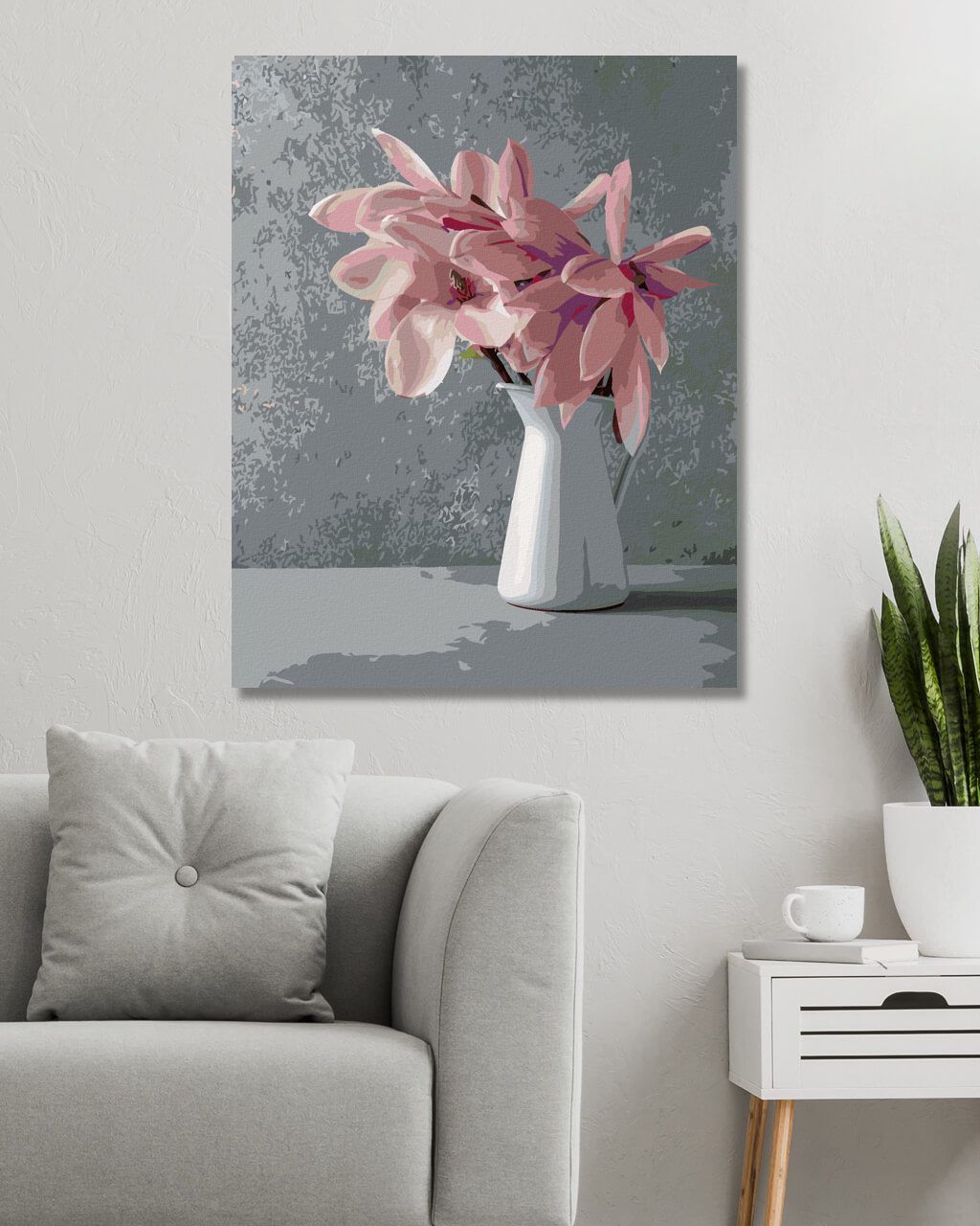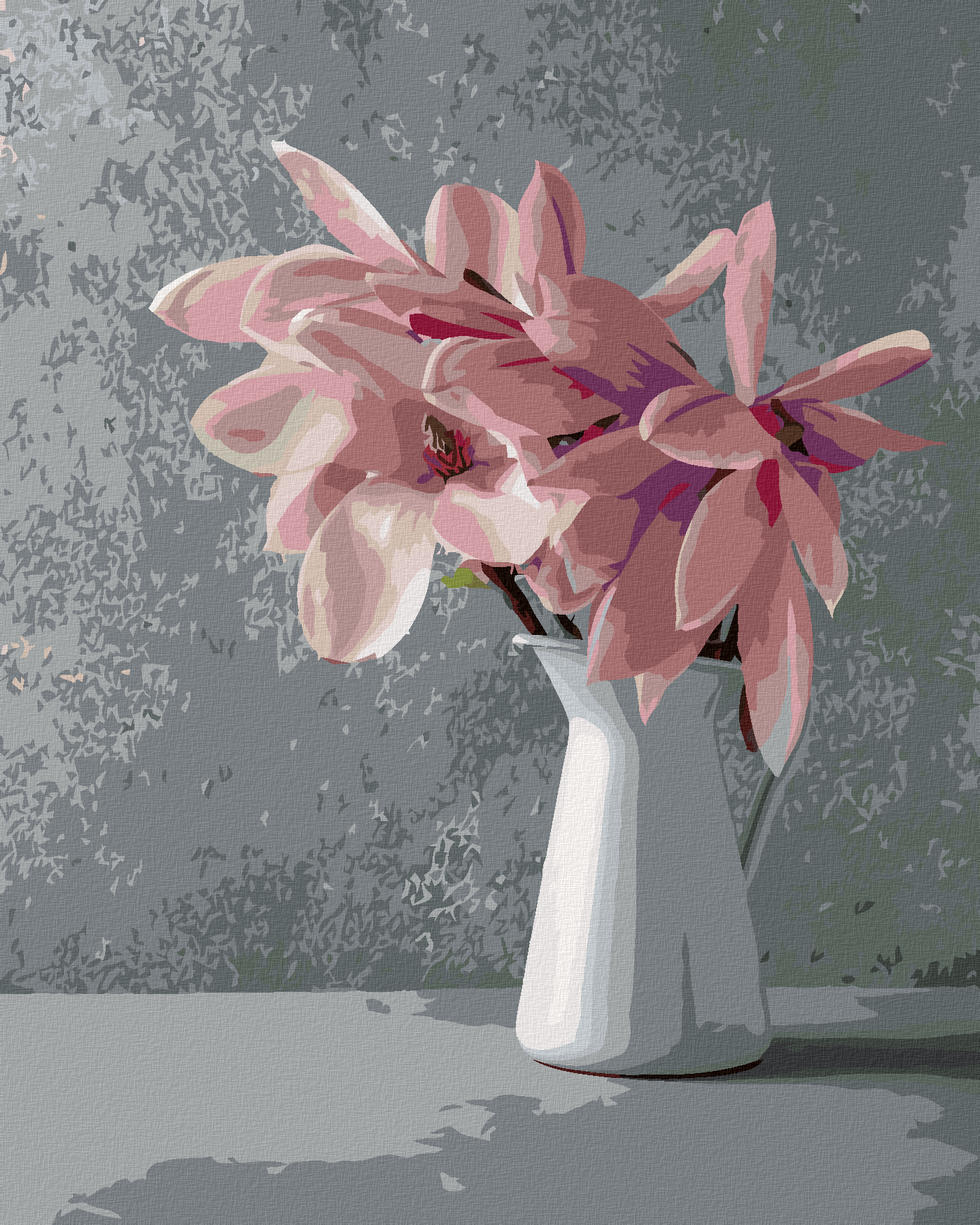 Рисуване по номера - РОЗОВИ МАГНОЛИИ В БЯЛА КЕРАМИЧНА ВАЗА
